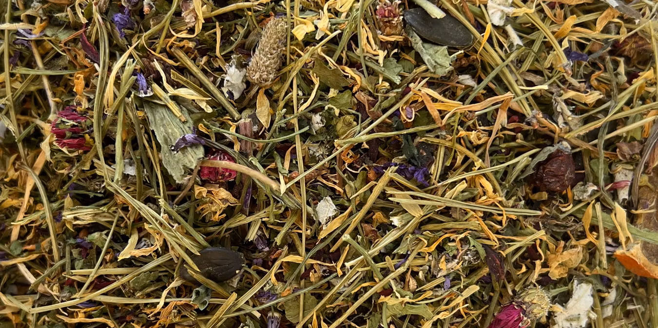 Sammansättning: Persiljestjälkar, hallonblad, nässla, bockhornsklöver, maskrosblad, blåklint, nypon, ringblomma, malva, blåbär, mjölktistelfrön, pepparmynta, svarta spiskumminfrön, apelsin, tranbär, fänkålsfrön, hibiskusblommor, rhodiola, granbarr, pumpafrön, hampafrön, linfrökaka.