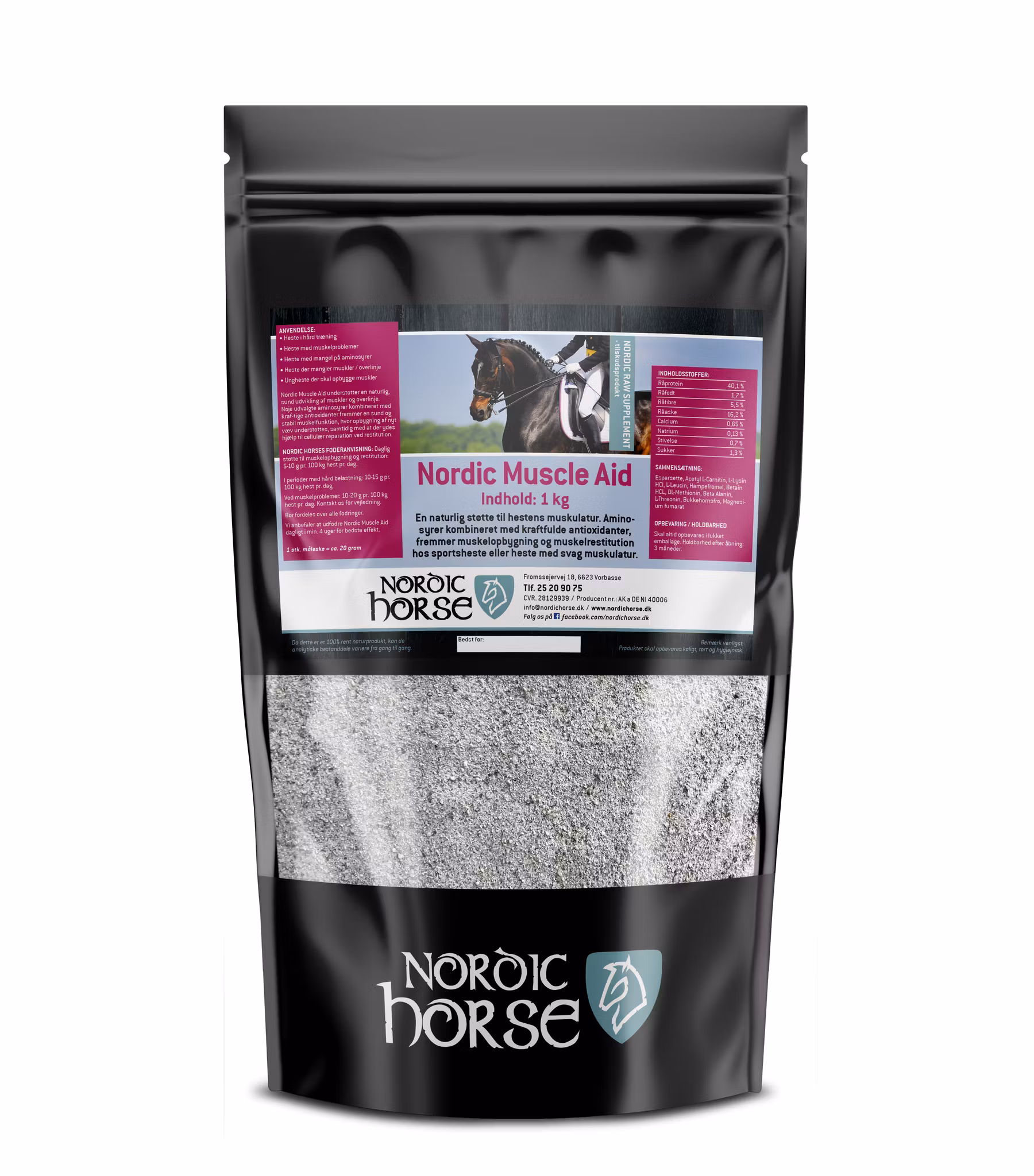 Nordic Muscle Aid är noggrant framtaget för att ge bästa möjliga stöd för hästens muskler. Produkten fokuserar starkt på att tillhandahålla essentiella aminosyror, men innehåller även andra ingredienser som i kombination med varandra bidrar till att främja muskelfunktionen, vilket ofta är grunden för muskelförlust, bristande muskeluppbyggnad och träningsrelaterad muskelömhet.